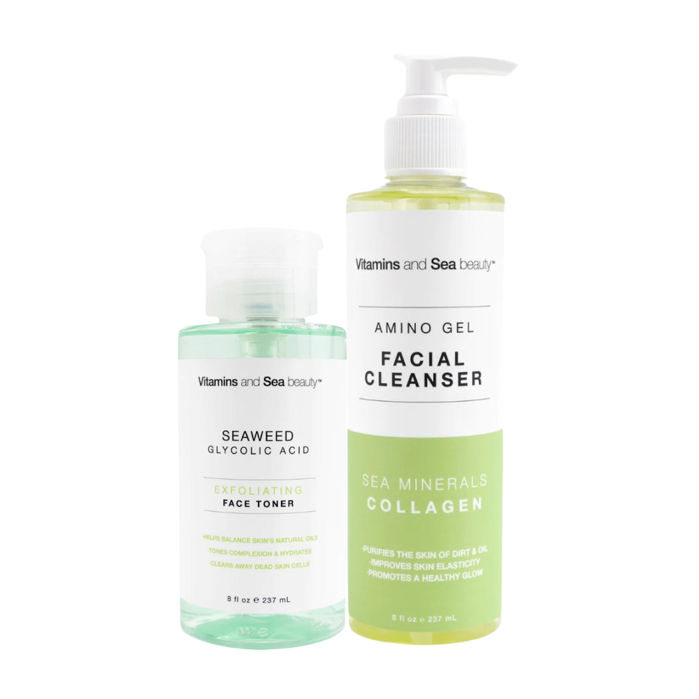 Set de limpieza y exfoliación que incluye el Amino Gel Facial Cleanser y el Exfoliating Face Toner, dos productos que trabajan juntos para limpiar, exfoliar y refrescar tu piel, dejándola suave y luminosa.